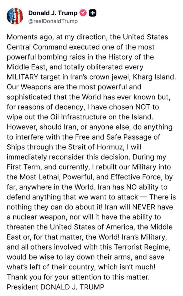 ประธานาธิบดีทรัมป์ประกาศผ่านโซเชียลมีเดียกองทัพสหรัฐถล่มใหญ่ “เกาะคาร์ก” หัวใจเศรษฐกิจอิหร่าน เว้นโครงสร้างพื้นฐานน้ำมัน พร้อมขู่ว่า หากยังกระทำการที่กระทบต่อการเดินเรือที่เสรีและปลอดภัยในช่องแคบฮอร์มุซ ฝ่ายสหรัฐจะไม่ละเว้น