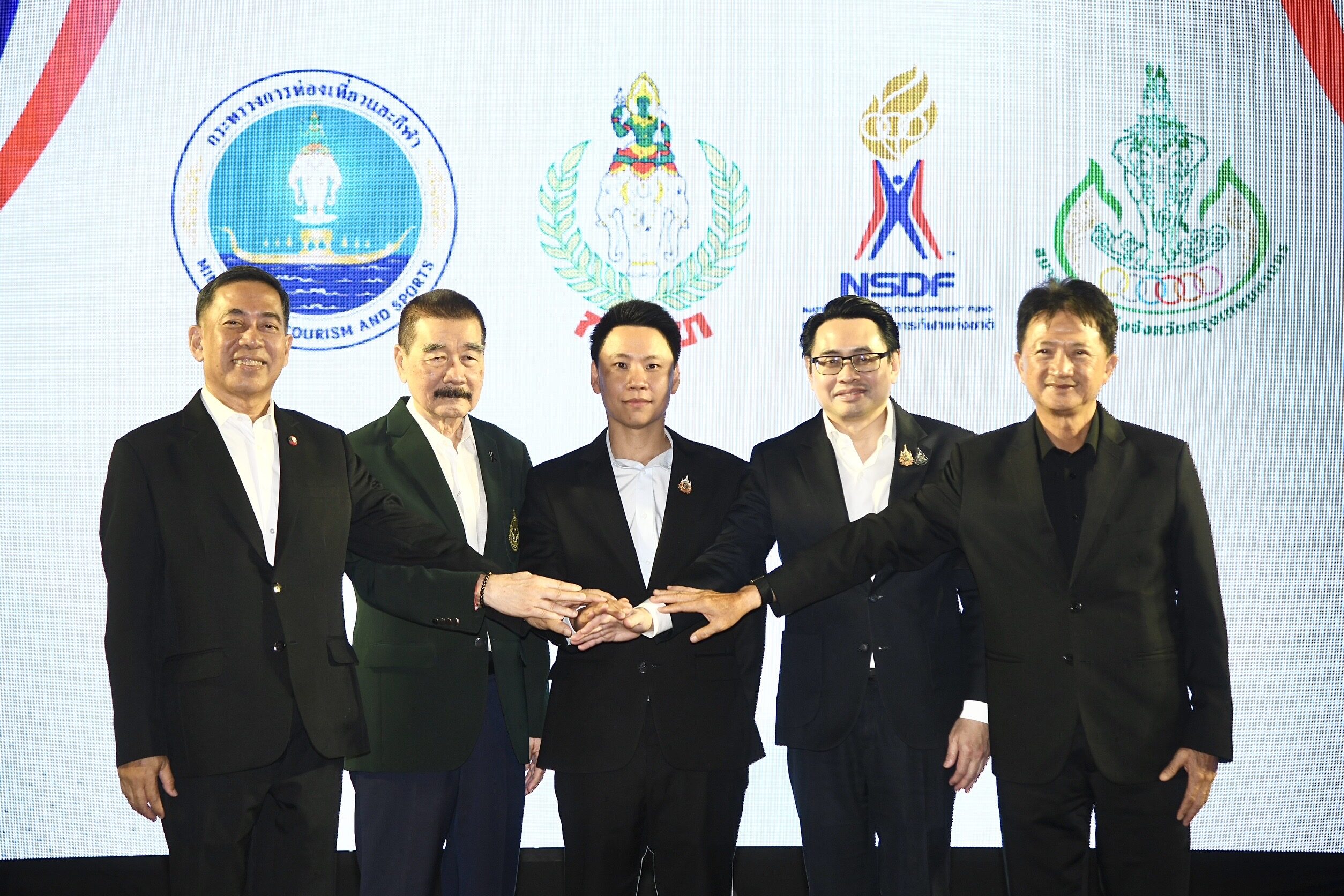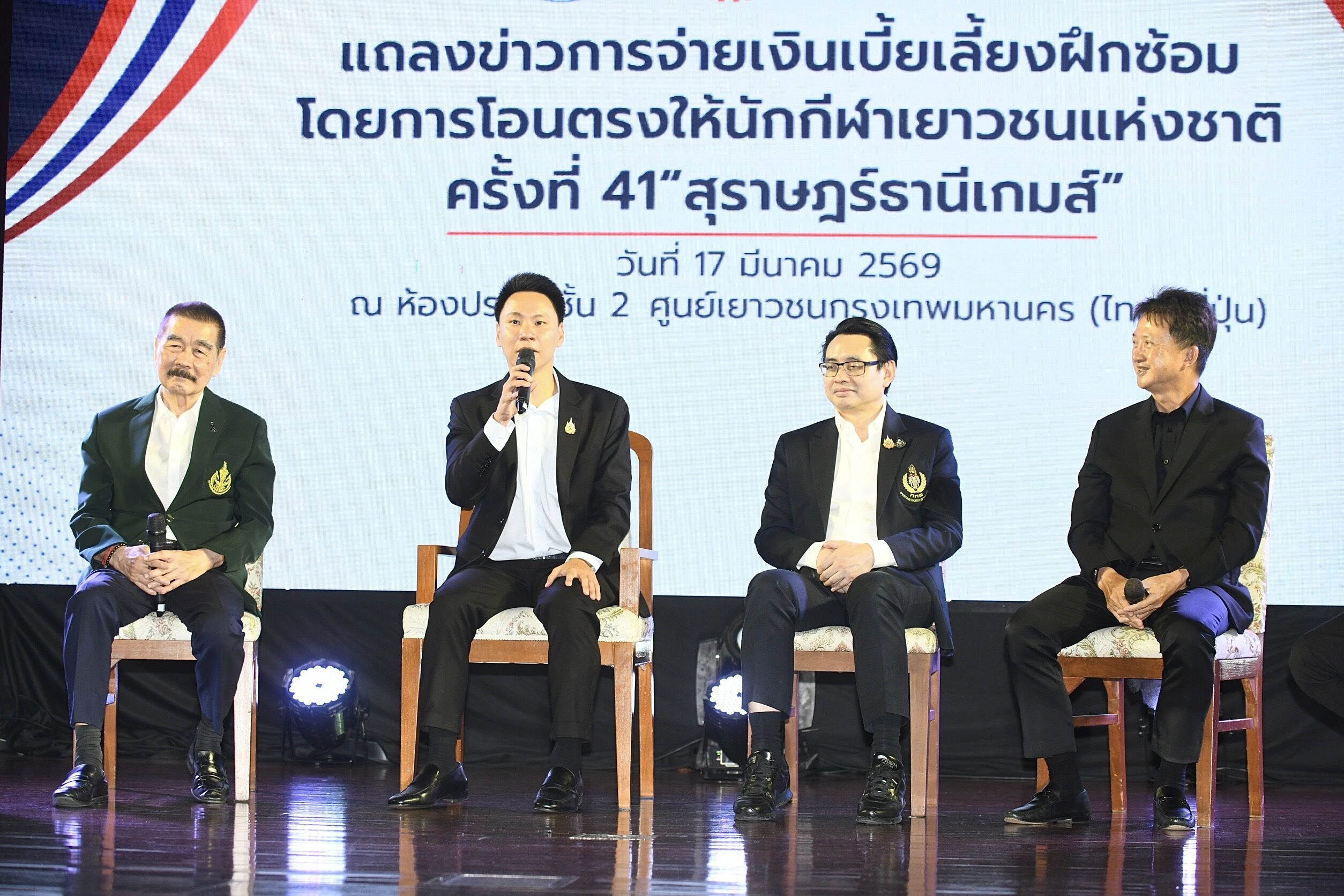 นายอรรถกร ศิริลัทธยากร รัฐมนตรีว่าการกระทรวงการท่องเที่ยวและกีฬา ดร.ก้องศักด ยอดมณี ผู้ว่าการการกีฬาแห่งประเทศไทย(กกท.) นายทนุเกียรติ จันทร์ชุม ผู้จัดการกองทุนพัฒนาการกีฬาแห่งชาติ และนายถิรชัย วุฒิธรรม นายกสมาคมกีฬาจังหวัดกรุงเทพมหานคร ร่วมงานแถลงข่าวการจ่ายเงินเบี้ยเลี้ยงฝึกซ้อมโดยการโอนตรงให้นักกีฬาเยาวชนแห่งชาติ ครั้งที่ 41 “สุราษฎร์ธานีเกมส์” ที่ศูนย์เยาวชนกรุงเทพมหานคร(ไทย-ญี่ปุ่น) เมื่อวันที่ 17 มีนาคม