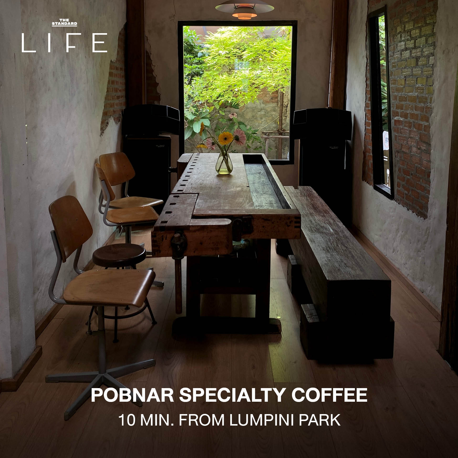 ตัวร้านได้รับการรีโนเวทโดยเก็บโครงสร้างเดิมของอาคารไว้ ผสมผสานสไตล์ Mid-century เข้ากับความโฮมมี่อย่างลงตัว เฟอร์นิเจอร์หลายชิ้นเป็นของสะสมส่วนตัวของเจ้าของร้านที่นำมาวางให้ดูขี้เล่นแต่ยังอบอุ่น บรรยากาศช่วงเช้าถึงสายจะมีแสงธรรมชาติส่องเข้ามาอย่างพอดี ทำให้ที่นี่ไม่ได้เป็นแค่คาเฟ่ แต่เป็นมุมนั่งคิดงาน อ่านหนังสือ หรือนั่งจิบกาแฟมองเมืองในมุมมองที่ต่างออกไปจากโต๊ะทำงานปกติ
