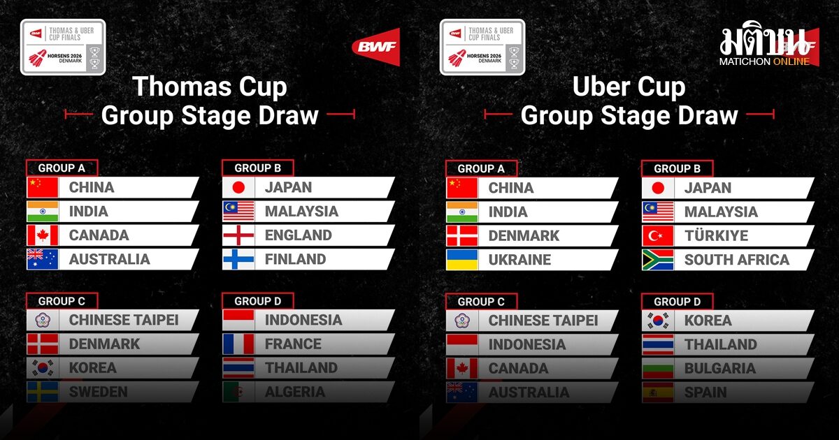สหพันธ์แบดมินตันโลก (บีดับเบิลยูเอฟ) จัดพิธีจับสลากแบ่งสายการแข่งขันแบดมินตันทีมชิงแชมป์โลก รายการ โธมัส-อูเบอร์ คัพ 2026 (BWF Thomas & Uber Cup Finals 2026) ที่เมืองฮอร์เซ่นส์ ประเทศเดนมาร์ก เมื่อวันที่ 18 มีนาคมที่ผ่านมา โดยมีทีมชั้นนำเข้าร่วมชิงชัยประเภทละ 16 ชาติ