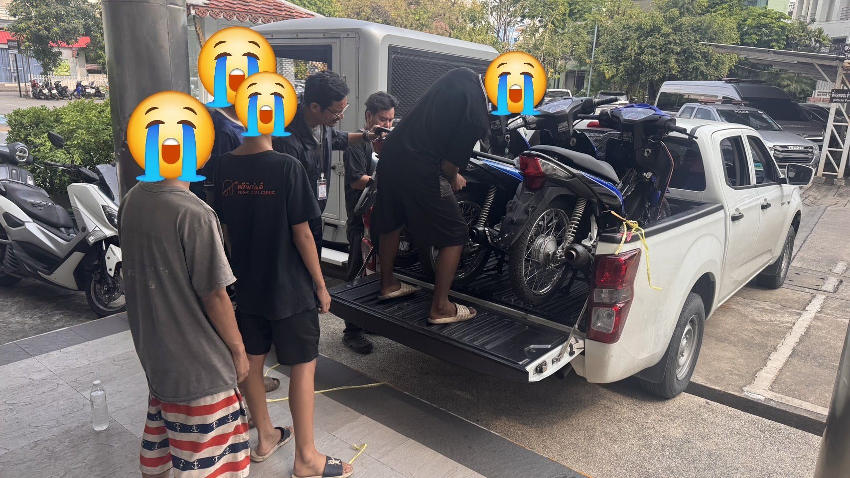 จากการสอบถามทั้ง 2 คนรับว่า รถจยย.ทั้ง 2 คัน ได้มาอยู่ในความครอบครองโดยการลักมา ตำรวจตรวจสอบแล้วพบว่า เป็นรถ จยย.หายไปหลังแฟลตตำรวจ สน.ประชาชื่นจริง นายเอ แจ้งว่า ด.ช.บี เป็นผู้ร่วมก่อเหตุลักรถจยย.ร่วมกันกับตน ด.ช.บี รับด้วยว่าเป็นผู้ร่วมก่อเหตุลักจยย.ดังกล่าว สาเหตุที่ขโมยเพื่อหาเงินมาใช้จ่าย ขายรถยย.ได้เงินคันละ 8,000 บาท