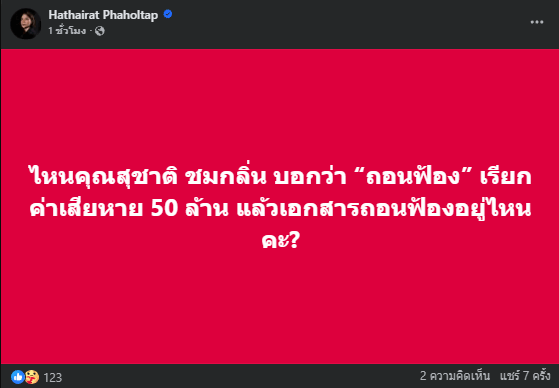 ล่าสุด เมื่อวันที่ 23 มีนาคม น.ส.หทัยรัตน์ พหลทัพ บรรณาธิการบริหาร The Isaan Record ได้โพสต์เฟซบุ๊กระบุถึงกรณีดังกล่าวว่า “ไหนคุณสุชาติ ชมกลิ่น บอกว่า ‘ถอนฟ้อง’ เรียกค่าเสียหาย 50 ล้าน แล้วเอกสารถอนฟ้องอยู่ไหนคะ?”