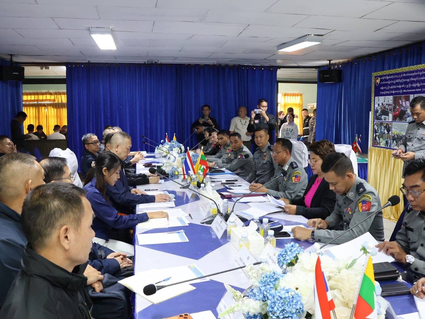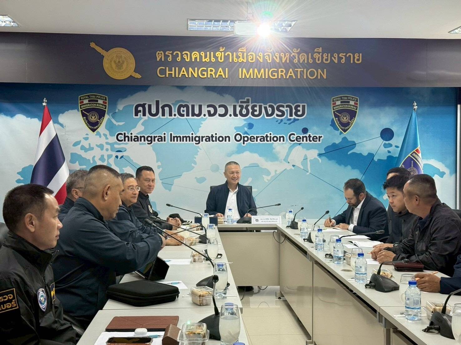 โดยมี พล.ต.ท.อรรถสิทธิ์ สุดสงวน จเรตำรวจ/หัวหน้าส่วนปฏิบัติการต่อต้านการค้ามนุษย์ ศตคม.ตร., พ.ต.อ.ณัฐ พรหมเทพ รองผู้บังคับการกองการต่างประเทศ ปฏิบัติหน้าที่ผู้ช่วยทูตฝ่ายตำรวจประจำสถานทูตไทย ณ กรุงย่างกุ้ง, นายสุริยน ประภาสะวัต รองอธิบดีอัยการ สำนักงานการสอบสวน, ผู้แทนจากหน่วยงานบังคับใช้กฎหมายจากสหรัฐอเมริกา ญี่ปุ่น และผู้แทนหน่วยประสานงานชายแดนไทย-เมียนมา (TBC) พร้อมผู้เกี่ยวข้องร่วมประชุม ณ ศูนย์ปฏิบัติการตรวจคนเข้าเมืองจังหวัดเชียงราย