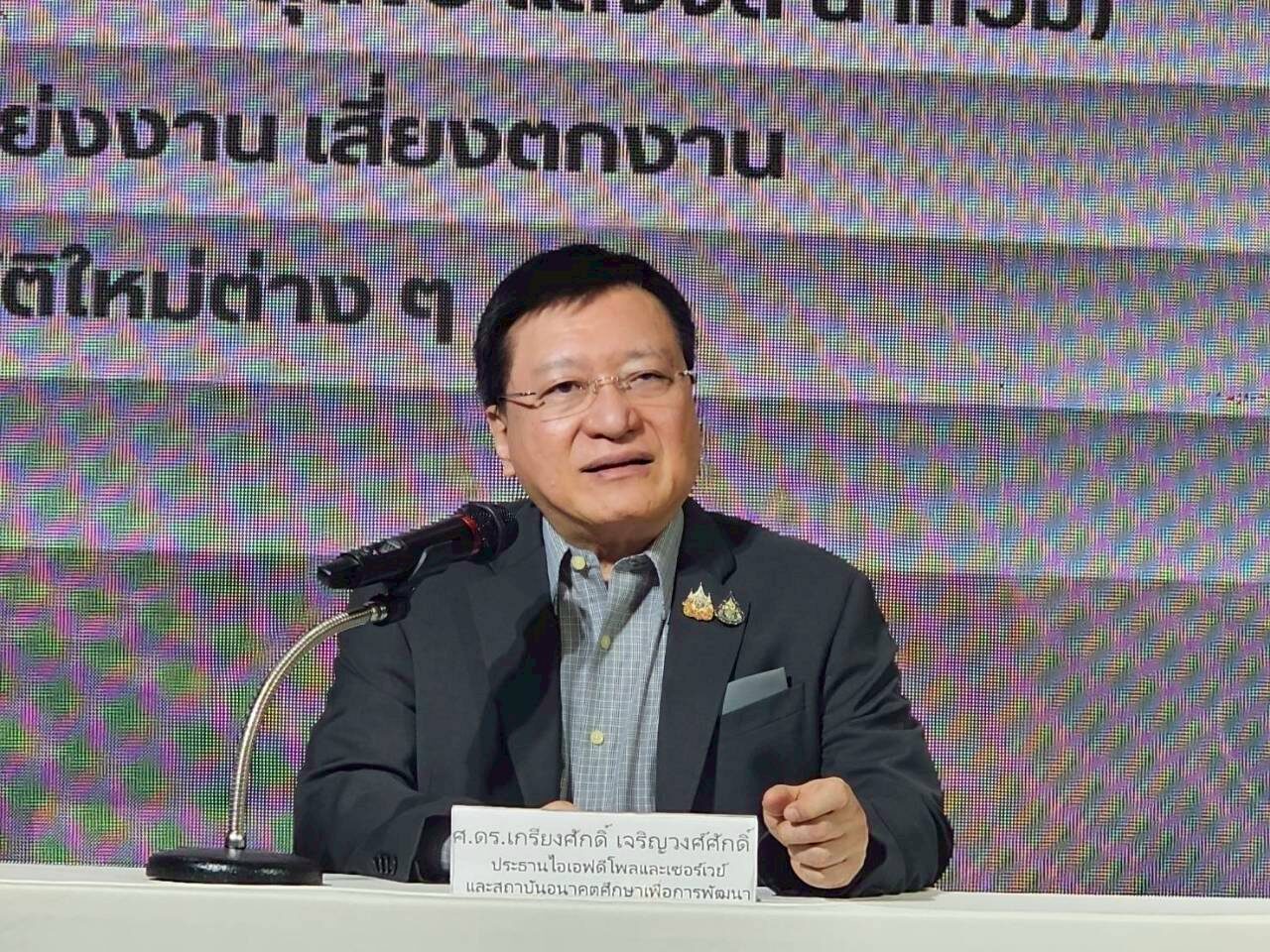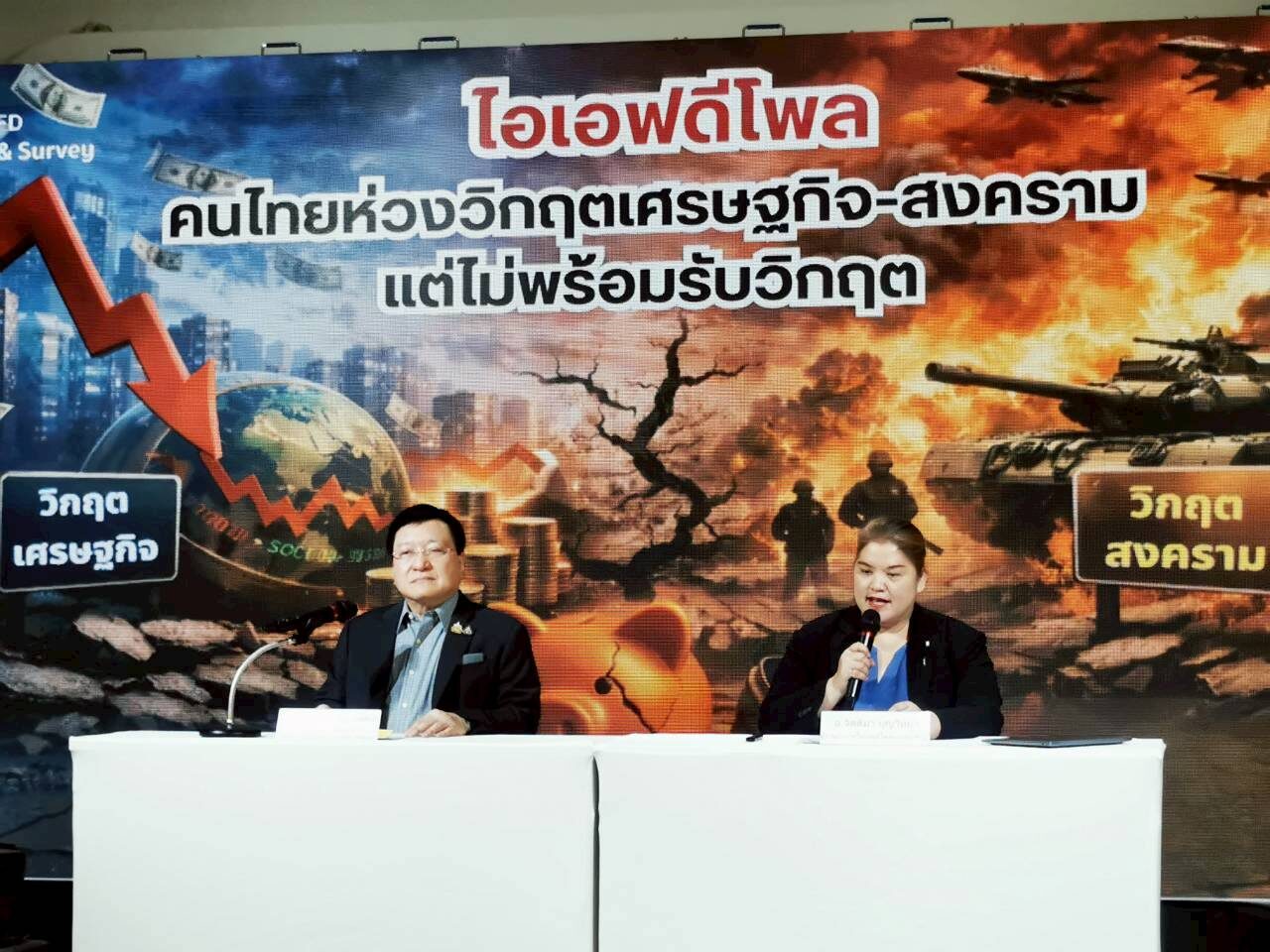 เมื่อวันที่ 24 มีนาคม ไอเอฟดีโพลและเซอร์เวย์ โดย ศ.ดร.เกรียงศักดิ์ เจริญวงศ์ศักดิ์ (ดร.แดน) ประธานสถาบันการสร้างชาติ ประธานสถาบันอนาคตศึกษาเพื่อการพัฒนา และนางจิตติมา บุญวิทยา ผู้อำนวยการไอเอฟดีโพลและเซอร์เวย์ แถลงผลสำรวจความคิดเห็น เรื่อง “คนไทยผวาวิกฤตเศรษฐกิจ-สงคราม! ช็อก 96.20% ไม่พร้อมรับมือ” กลุ่มตัวอย่าง 1,237 ราย สำรวจช่วง 18-21 มี.ค. 2569 ครอบคลุม 6 ภูมิภาค ค่าความเชื่อมั่น 95% ค่าคลาดเคลื่อน ±3%