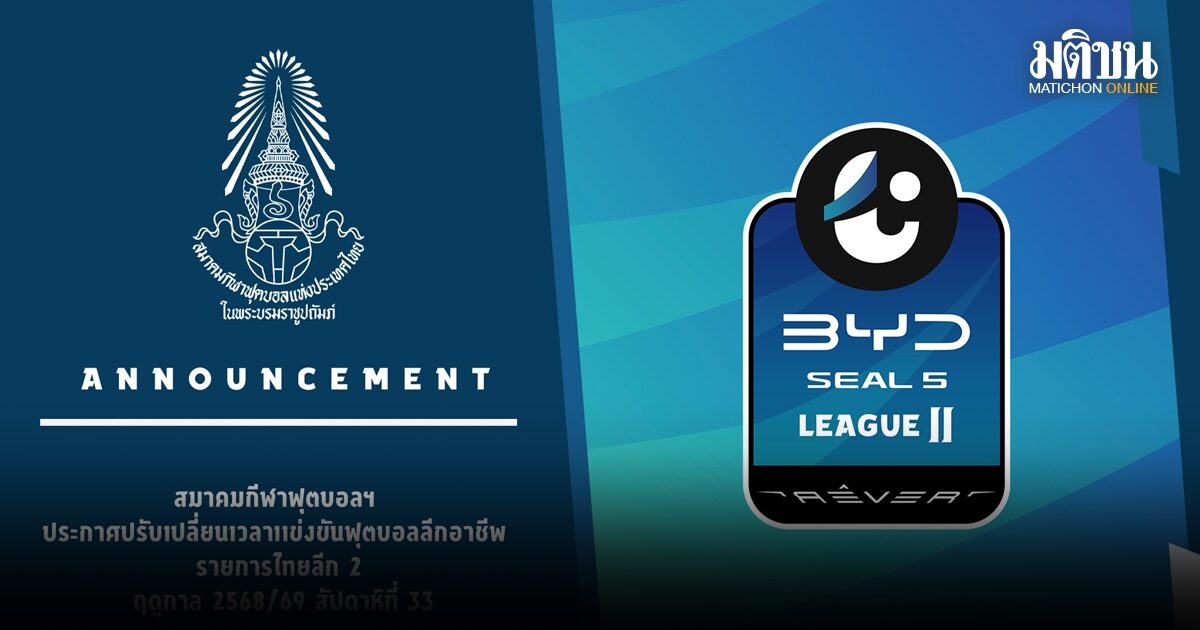 สมาคมกีฬาฟุตบอลฯ พิจารณาแล้วจึงขอแจ้งเปลี่ยนแปลงกำหนดการแข่งขันฟุตบอลไทยลีก 2 ประจำ สัปดาห์ที่ 33 โดยให้ดำเนินการแข่งขันในระหว่างวันที่ 18-19 เมษายน 2569 และกำหนดเวลาเริ่มการแข่งขันในเวลา 18.00 น. พร้อมกันทุกคู่ ทั้งนี้ ขอความร่วมมือให้สโมสรของท่านดำเนินการเตรียมความพร้อม ด้านสถานที่จัดการแข่งขัน และปฏิบัติตามระเบียบข้อบังคับว่าด้วยการจัดการแข่งขันกีฬาฟุตบอลลีกอาชีพอย่างเคร่งครัดต่อไป