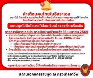 สถานเอกอัครราชทูตไทย ณ กรุงเทลอาวีฟ ประเทศอิสราเอล ออกประกาศแจ้งเตือนคนไทยในอิสราเอลว่า ขณะนี้มีมิจฉาชีพแอบอ้างว่าเป็นเจ้าหน้าที่จากสถานทูต หลอกให้โอนเงินโดยอ้างว่าจะช่วยดำเนินการพากลับประเทศไทย โดยสถานทูตไม่มีนโยบายให้โอนเงินเพื่อจองตั๋วเครื่องบิน