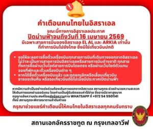 เมื่อวันที่ 29 มีนาคม สถานเอกอัครราชทูตไทย ณ กรุงเทลอาวีฟ ประเทศอิสราเอล ออกประกาศถึงคนไทยในอิสราเอลอีกครั้ง ย้ำเตือนกรณีทางการอิสราเอลปิดน่านฟ้า จนถึงวันที่ 16 เมษายน 2569 และยังมีเฉพาะสายการบินของอิสราเอล EL AL และ ARKIA เท่านั้น ที่ทำการบินไปยังไทย ซึ่งมิใช่เที่ยวบินปกติ