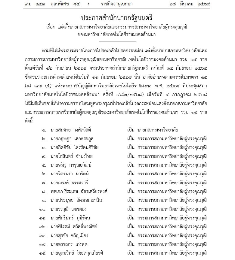 ราชกิจจานุเบกษา เผยแพร่ ประกาศสำนักนายกรัฐมนตรี เรื่อง แต่งตั้งนายกสภามหาวิทยาลัยและกรรมการสภามหาวิทยาลัยผู้ทรงคุณวุฒิของมหาวิทยาลัยเทคโนโลยีราชมงคลล้านนา