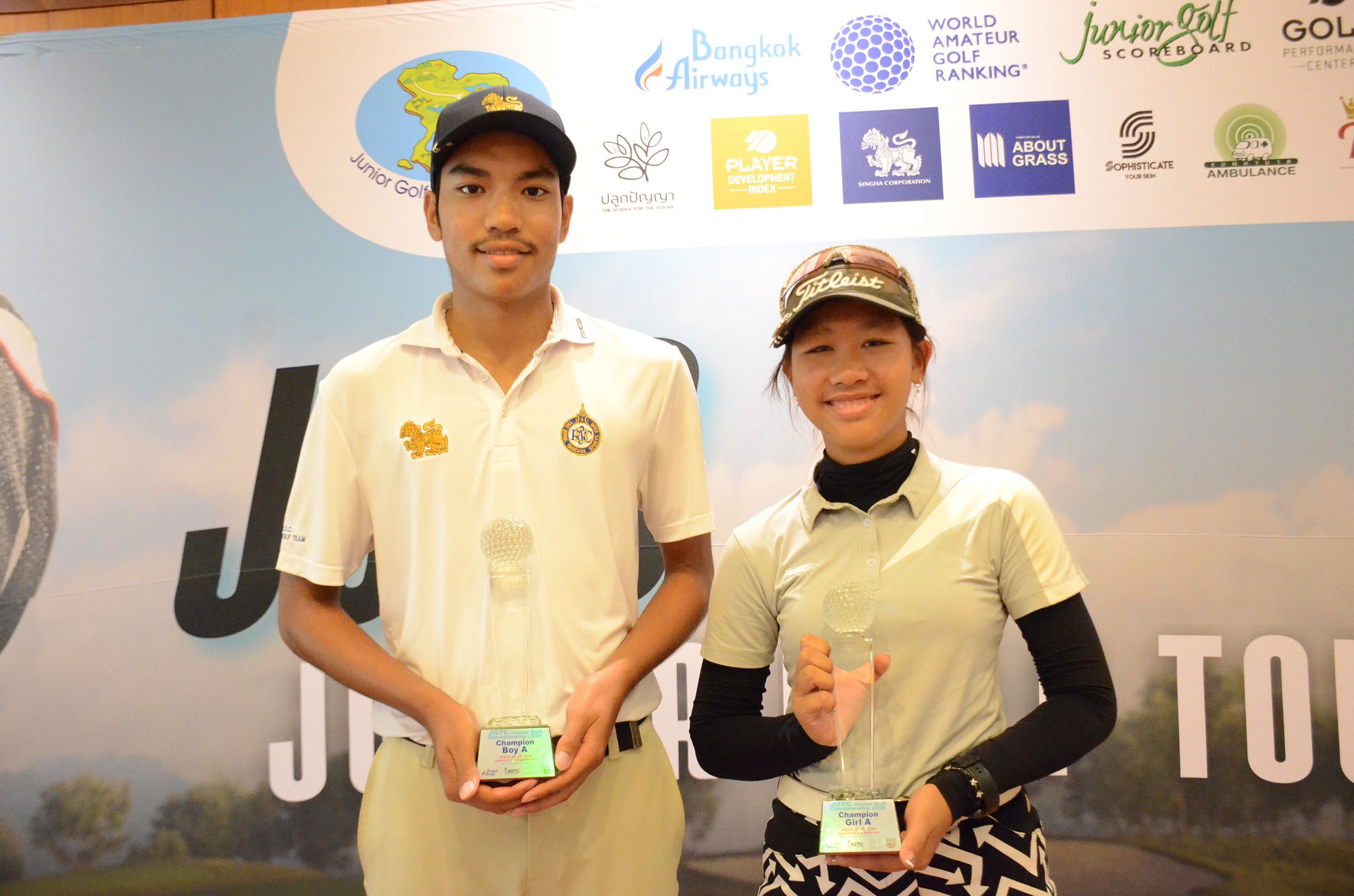 ปรมิศวร์ แสงมณี จากกรุงเทพฯ และพิชญพัตต์ สุรอารีย์กุล จากโคราช คว้าแชมป์คลาสเอ ชาย-หญิง จากการแข่งขันกอล์ฟเยาวชน “เจจีทีซี จูเนียร์ กอล์ฟ ทัวร์ 2026” ณ สนามกอล์ฟเลควูด คันทรีคลับ (คอร์สเลค-วูด) พาร์ 72 จ.สมุทรปราการ เมื่อวันที่ 29 มีนาคม