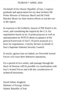 “จากบทสนทนากับนายกรัฐมนตรีเชห์บาซ ชารีฟ และจอมพลอาซิม มูนีร์ แห่งปากีสถาน ซึ่งทั้งสองคนได้ขอให้ผมระงับการส่งกำลังทำลายล้างไปยังอิหร่านในคืนนี้ และโดยมีเงื่อนไขว่าสาธารณรัฐอิสลามอิหร่านตกลงที่จะเปิดช่องแคบฮอร์มุซอย่างสมบูรณ์ ทันที และปลอดภัย ผมจึงตกลงที่จะระงับการทิ้งระเบิดและการโจมตีอิหร่านเป็นเวลาสองสัปดาห์ นี่จะเป็นการหยุดยิงสองฝ่าย!” ทรัมป์โพสต์ข้อความบนโซเชียลมีเดีย