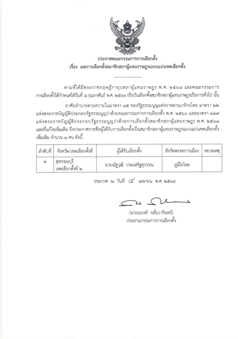เมื่อวันที่ 8 เมษายน ผู้สื่อข่าวรายงานว่า ตามคณะกรรมการการเลือกตั้ง (กกต.) ได้กำหนดให้มีการเลือกตั้งทั่วไปวันที่ 8 กุมภาพันธ์ 2569 และได้ประกาศรับรองผลการเลือกตั้ง ส.ส.แบบบัญชีรายชื่อ จำนวน 100 คน และแบบแบ่งเขต 399 คน รวม 499 คน ยกเว้น จ.สุพรรณบุรี เขตเลือกตั้งที่ 2 เพียง 1 เขตนั้น โดยผู้ที่ได้รับผลคะแนนสูงสุด คือ นายณัฐวุฒิ ประเสริฐสุวรรณ จากพรรคภูมิใจไทย (ภท.) เนื่องจากอยู่ระหว่างตรวจสอบข้อเท็จจริงเกี่ยวกับกระบวนการนับคะแนนว่าเป็นการนับคะแนนไม่ถูกต้องหรือเป็นการนับคะแนนที่ไม่สุจริตหรือเที่ยงธรรมหรือไม่