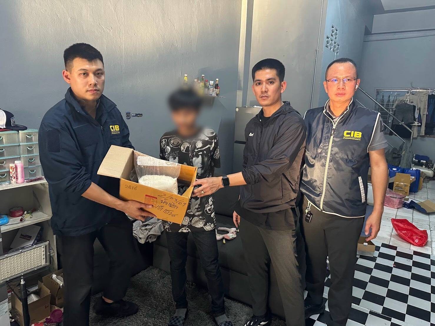 พล.ต.ท.ณัฐศักดิ์ กล่าวว่า ก่อนหน้าเจ้าหน้าที่เข้าตรวจค้นเป้าหมายใน 4 จังหวัด ประกอบด้วย กรุงเทพฯ, อุดรธานี, ร้อยเอ็ด และนครศรีธรรมราช สามารถจับกุมผู้ต้องหาได้รวม 7 ราย พร้อมยึดของกลาง สารเอโทมิเดต (Etomidate) ชนิดผงบรรจุถุงพลาสติก 952 กรัม และที่อายัดจากด่านศุลกากรอีก 28 กิโลกรัม, ผลิตภัณฑ์บุหรี่ไฟฟ้า หัวพอตผสมสารเอโทมิเดต 920 ชิ้น, วัตถุดิบและอุปกรณ์ น้ำยาบุหรี่ไฟฟ้า และน้ำยาแต่งกลิ่น (กลิ่นผลไม้และขนมหวาน) รวม 17 แกลลอน, อุปกรณ์วิทยาศาสตร์สำหรับผสมสารเคมี, ยาไอซ์ 1.3 กรัม