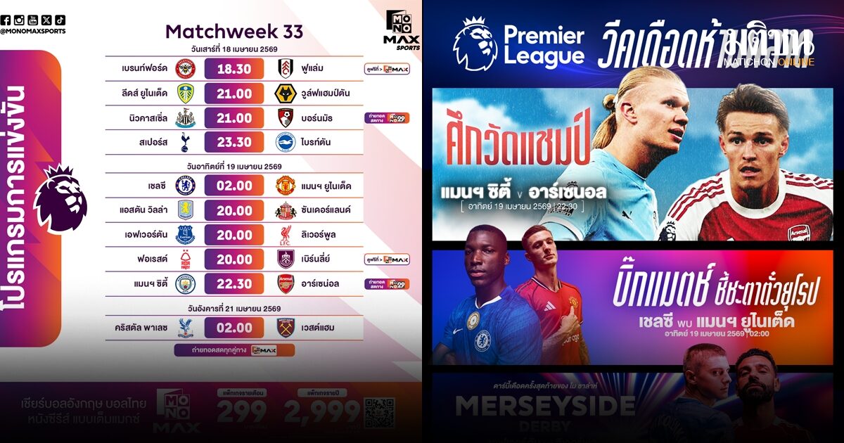 จากนั้นช่วงค่ำ วันอาทิตย์ที่ 19 เมษายน 2569 เวลา 20.00 น. Monomax ยิงสดพร้อมกันสามสนามเริ่มจาก แอสตัน วิลล่า พบ ซันเดอร์แลนด์ เจ้าบ้านหวังเก็บแต้มรักษาโมเมนตัม ขณะที่ทีมเยือนต้องการคะแนนหนีโซนอันตราย ต่อด้วยน็อตติ้งแฮม ฟอเรสต์ พบ เบิร์นลีย์ เกมสำคัญของทีมกลางตารางที่ทุกคะแนนมีความหมาย และเมอร์ซีย์ไซด์ดาร์บี้ เอฟเวอร์ตัน เปิดบ้านรับ ลิเวอร์พูล ศึกแห่งศักดิ์ศรีเมืองลิเวอร์พูลที่มักเต็มไปด้วยความดุดัน เข้มข้น