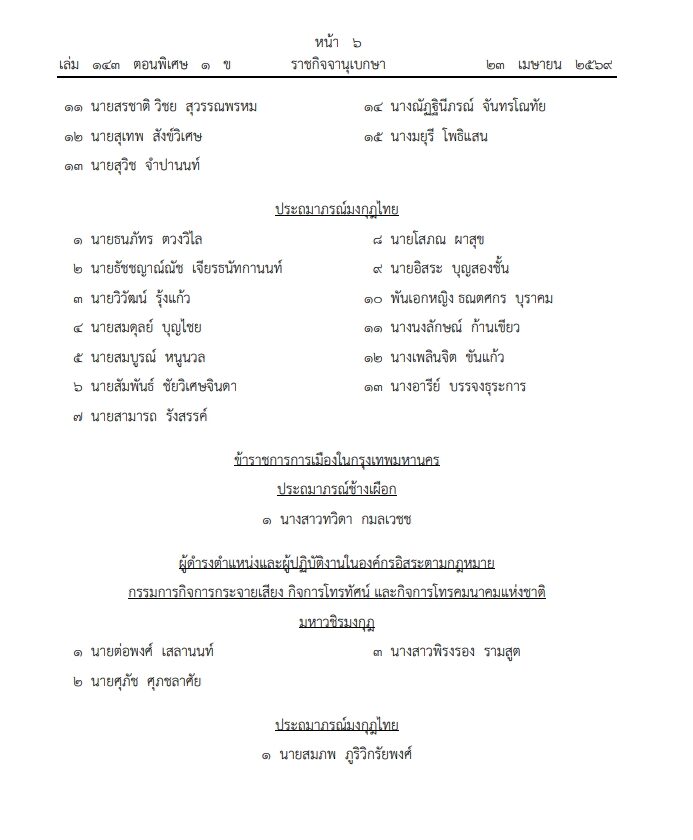 เมื่อวันที่ 23 เมษายน ราชกิจจานุเบกษา เผยแพร่ประกาศ พระราชทานเครื่องราชอิสริยาภรณ์อันเป็นที่เชิดชูยิ่งช้างเผือก และ เครื่องราชอิสริยาภรณ์อันมีเกียรติยิ่งมงกุฎไทย ชั้นสายสะพาย ประจำปี 2568